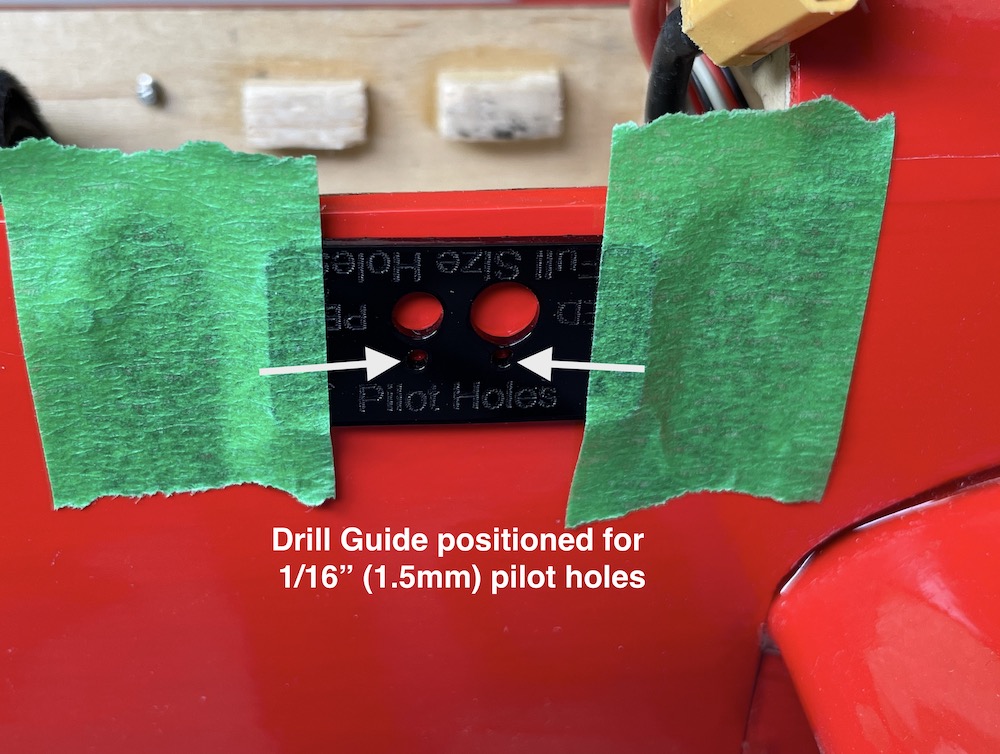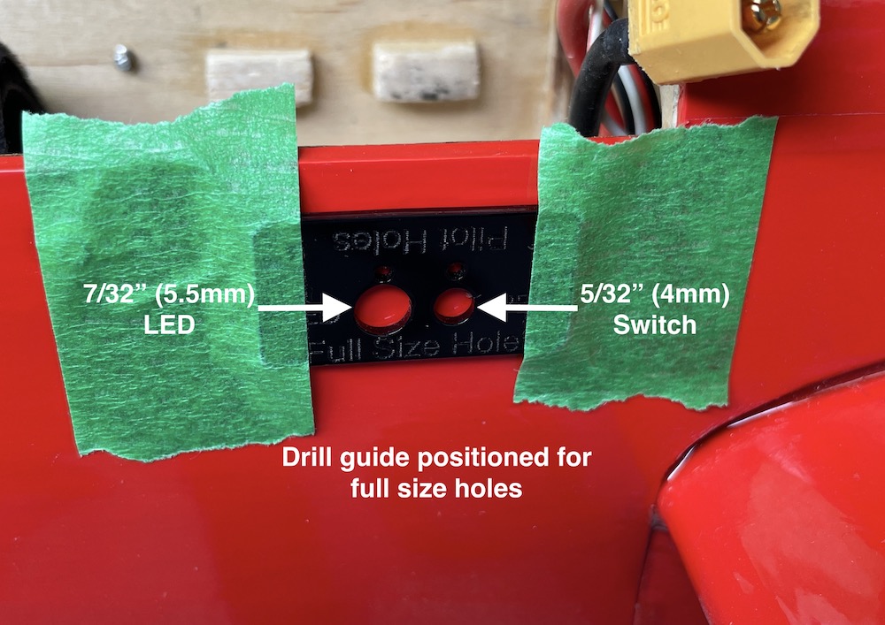 Use the supplied drill template to locate the position of the two holes to be drilled through the fuselage sides. The template has two sets of holes; choose a set of holes that suit your technique. One set is used to locate small 1/16” (1.5mm) diameter pilot holes and the other set for the final suggested hole diameter; a 5/32” (4mm) drill for the switch and a 7/32 (5.5mm) drill for the LED should provide a little extra clearance for installation.