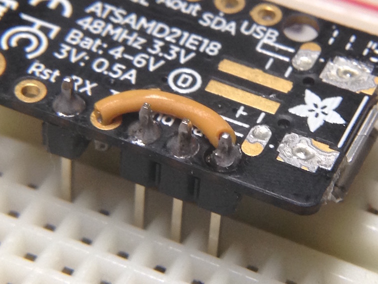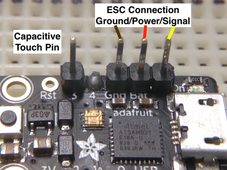 Optional - instead of a short length of wire you can use a 1K ohm resistor to join the two pins. This adds protection to the output pin of the Trinket M0 in case you make a mistake and install the ESC connector the wrong way.