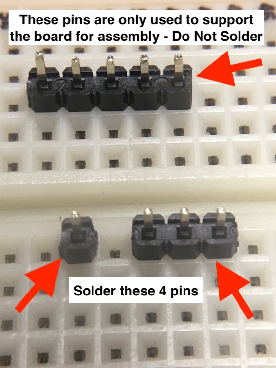 Step 1 - Trim the header strip into a (3) pin and a (1) single pin. Using a small breadboard helps in alignment of the pins. A portion of unused header strip can be used to support the board for soldering.